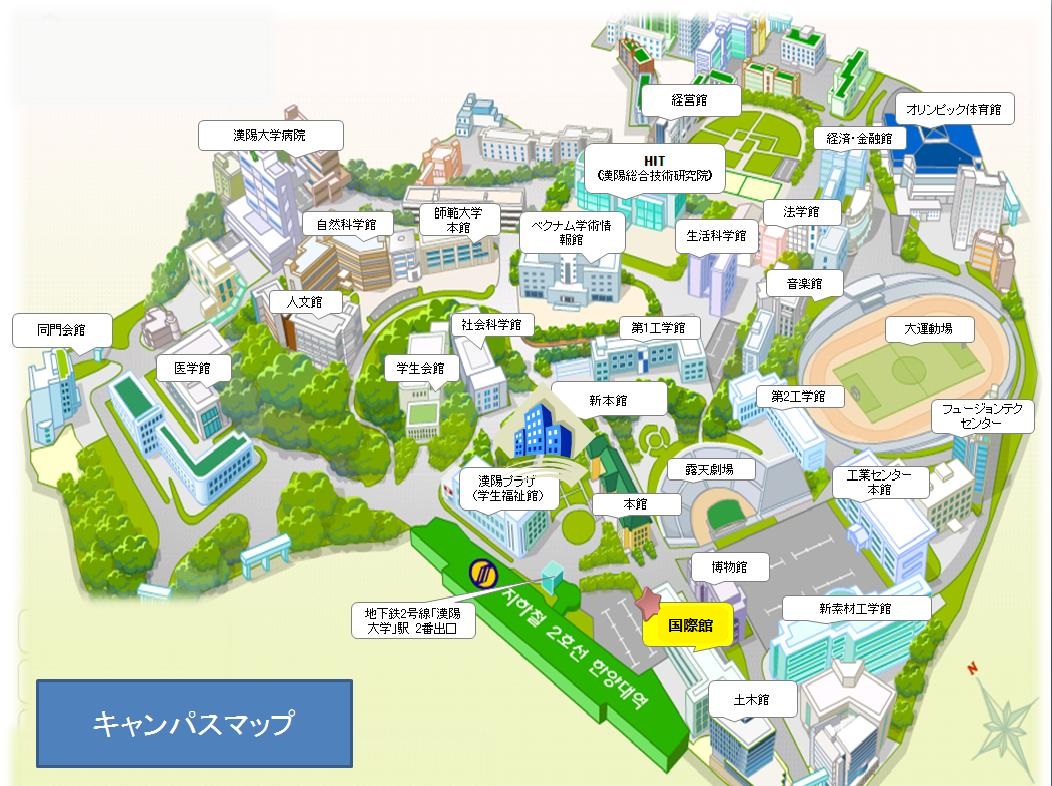 ◆漢陽大学 ... ソウル市内の環状線である地下鉄2号線の駅が学校構内にあり駅の出口を出たら1分で語学堂。最も駅から近い語学堂です。どこに出かけるのも便利なので短い日程でも余暇時間にお出かけもできますし、2号線沿線の宿泊先なら便利に通うことができます。漢陽大学は人に優しいバリアフリー。車いすも問題ありません。駅の車両とホームの間隔も大丈夫。あとはすべてエレベータとスロープです。